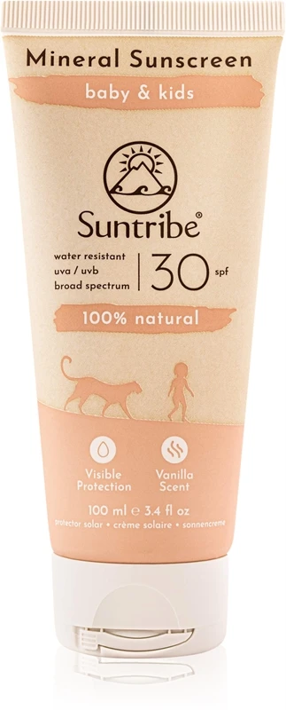 Le produit avec le filtre minéral UV Suntribe Kids Mineral Sunscreen offre une protection efficace de la peau contre le soleil.